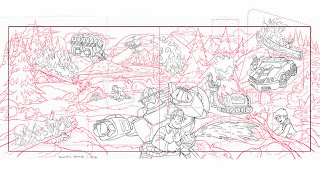 One thing Disney requests when assigning a job like this is that the artwork needs to be usable for posters as well as the DVD cover. So what you don't see here is that there is additional background that is cropped out by the Mickey Ear frame and the edges of the border. They need to have this to fit printing at the poster size. Another feature that the artwork has to have is that every character and background element has to be fully complete and on it's own separate layer so that Disney can easily isolate and extract parts of this illustration to use on other materials such as standees, flyers, other packaging, what have you. So what you have here, essentially, is a giant jig-saw puzzle with pieces that can work on their own but still need to function together seamlessly in the full image.